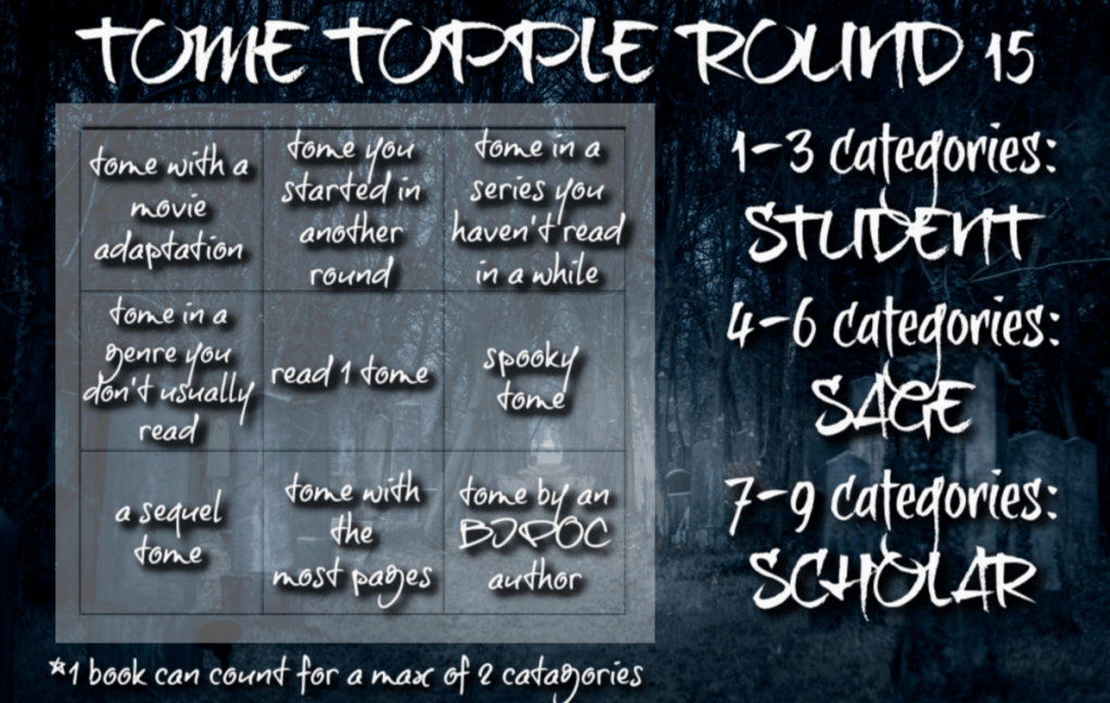 It’s hard to believe that April is right around the corner and with it… THE NEXT ROUND OF TOME TOPPLE! That’s right, Tome Topple Round 16 will begin on April 15th and run until April 28th! Better start picking out those books because we have some exciting updates happening this time around!