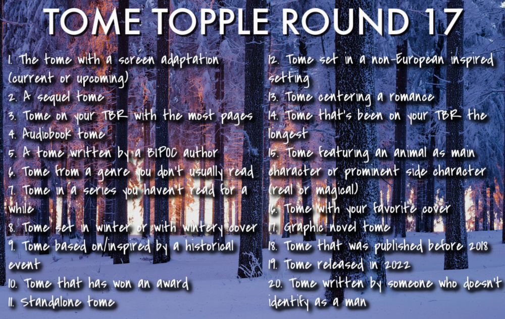 It’s your favorite geek, back from the dead! It has been an absolutely wild last couple of months but I am back and promise to be better than ever (I’ll be posting an update / Where the heck have I been post this weekend). I’m also breaking out of my hiatus to announce the next round of Tome Topple! Round 17 begins this Friday, December 9th (aka TOMORROW) at midnight in your timezone and goes until midnight on December 22nd!
